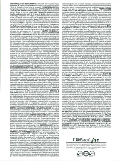 DENOMINA.ÇÃO DO MEDICAMENTO: RINIALER 10 mg comprimidos. electrocardiograma, não revelaram diferenças significativas no intervalo QTc.