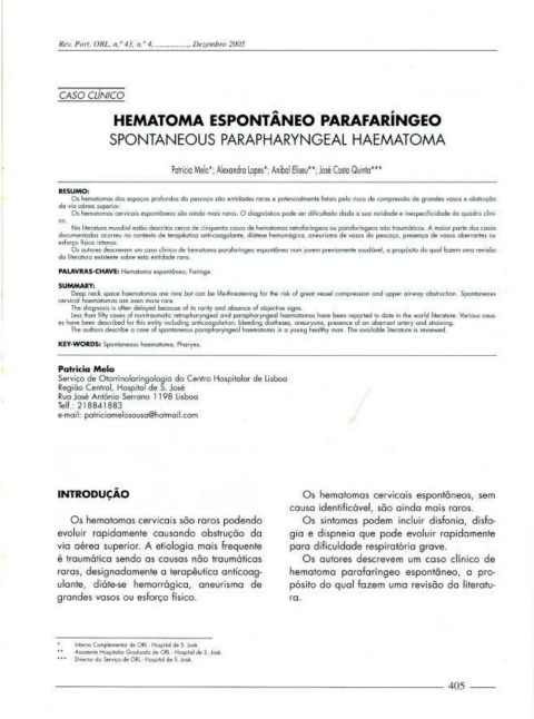 raras, designadamente o terapêutico onticoog~ hematoma poroforíngeo espontâneo, o pro-