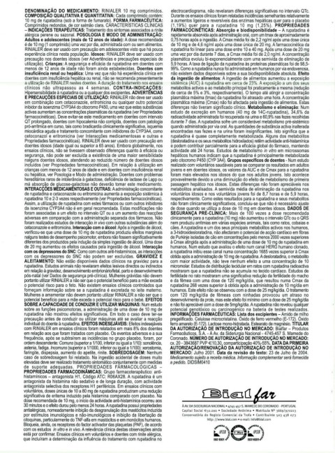 DENOMINA.ÇÃO DO MEDICAMENTO: RINIALER 10 mg comprimidos. electrocardiograma, não revelaram diferenças significativas no intervalo QTc.
