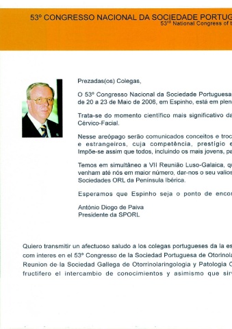 Prezadas(os) Colegas, Trata-se do momento científico acial. Cérvico-F cuja estrangeiros, e Sociedades ORL da Península Ibérica. Espinho que Esperamos António Diogo de Paiva Presidente da SPORL conocimientos de intercambio
