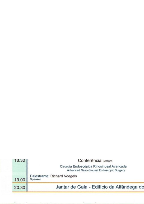 Sala Room Critérios para a Selecção Racional dos Exames Complementares de Diagnóstico em Otoneurologia Critérios Clínicos e Audiológicos para a Prescrição das Próteses Auditivas Mercedes Piiieiro Lopez Otorhinolaringology - Cirurgia Endoscópica Rinosinusal Avançada Jantar de Gala -