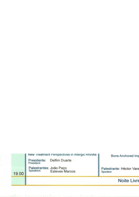 Costa Verde Comunicações Livres Free Papers Otologia Otology Curso lnstructional Course lmagiologia do Colesteatoma lmagiology of Cholesteatoma Vincent Darrouzet Conferência Lecture Adenocarcinomas Nasosinusais Naso-Sinusal Adenocarcinoma Carlos Suarez Simpósio Symposia BIAL Novas Perspectivasno Tratamento da Rinite alérgica New Treatment Perspectives in Allergic Rhinitis Delfim Duarte Esteves Marcos