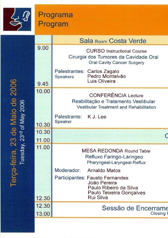 Costa Verde Roma Sala Room CURSO lnstructional Course CURSO lnstructional Course Cirurgia dos Tumores da Cavidade Oral Uso da Cartilagem na Cirurgia de Ouvido Oral Cavity Cancer Surgery The use of Cartilage in Ear Surgery Palestrantes: Carlos Carvalho Hélder Silva Speakers CONFERÊNCIA Lecture CONFERÊNCIA Lecture Reabilitação e Tratamento Vestibular Alterações da Voz de Causa Neurológica Vestibular Treatment and Rehabilitation N