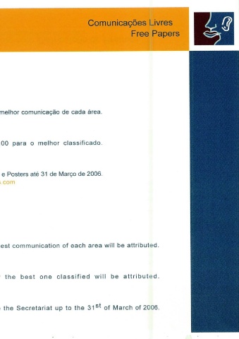 COMUNICAÇÕES LIVRES O Com a duração de 1 Otologia Formato: Power Point I Multimédia. RS POSTE avaliados Serão Ox90 cm. Formato 11 DATA LIMITE FREE PAPERS With the duration of 1 Otology Format: Power Point I Multimedia RS POSTE evaluated be Will Size: 11 Ox90 cm. DEAD LINE summaries The