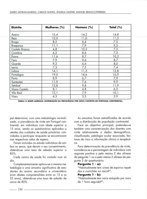 TABELA 2: RINITE ALÉRGICA: DISTRIBUIÇAO DA PREVALÊNCIA POR SEXO E DISTRITO EM PORTUGAL CONTINENTAL.