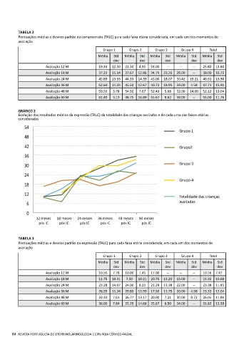 Pontuações médias e desvios padrão da expressão (TALC) para cada faixa etária considerada, em cada um dos momentos de
