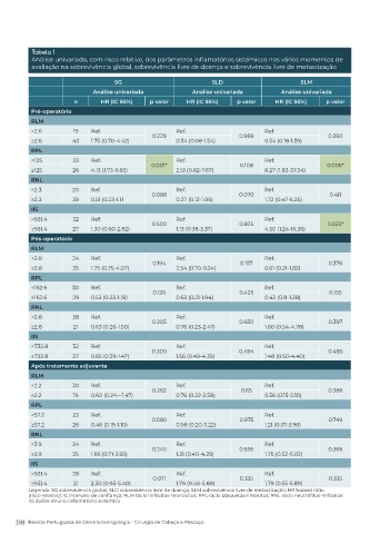 (risco relativo); IC intervalo de confiança; RLM rácio linfócitos-monócitos; RPL rácio plaquetas-lintócitos; RNL rácio neutrófilos-linfócitos